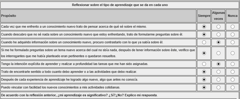 El desarrollo de la matriz da como resultado que es considerado mi aprendizaje significativo lo que quiere decir que los nuevos conocimientos que adquiero lo complemento con los conocimientos que anteriormente tengo. Voy ampliando mi conocimiento y así puedo dar solución a los problemas que en la realidad se me puedan presentar gracias al conocimiento.